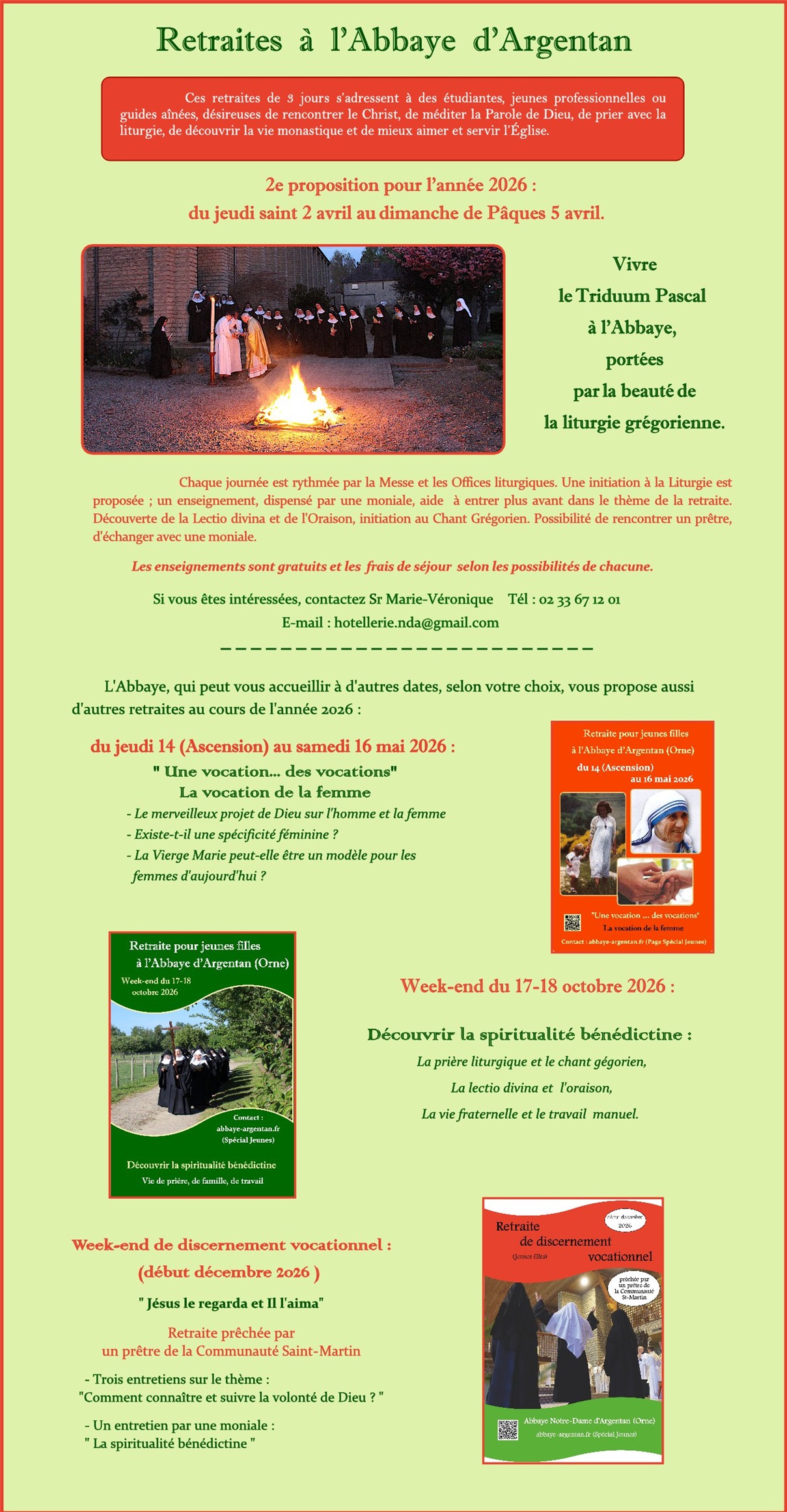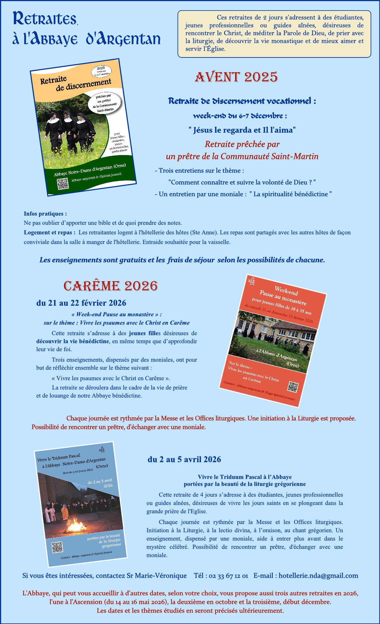 L'Abbaye Notre-Dame d'Argentan propose des séjours "personnalisés" aux jeunes filles désirant faire une halte dans le silence et la prière. À l’hôtellerie monastique, l'accueil s'adapte aux désirs de chacune : séjour individuel ou en petit groupe, tout au long de l'année.